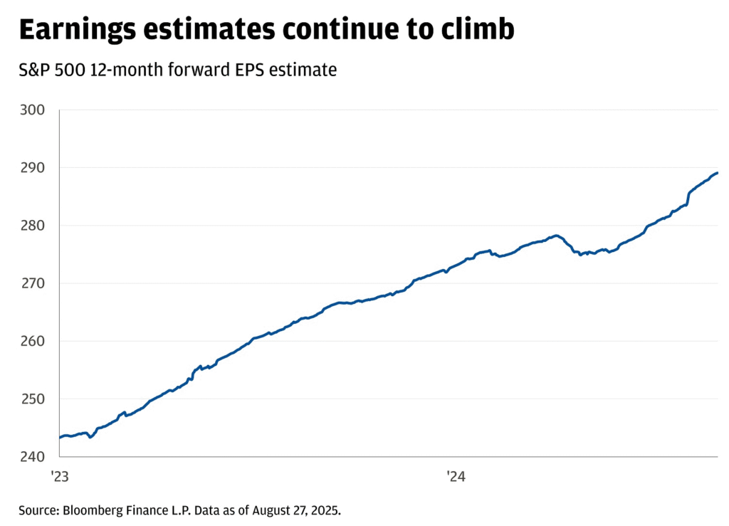 O que está movendo os preços? O crescimento esfriou, mas não quebrou, e o repasse tarifário elevou a inflação sem prejudicar os lucros. A Corporate America fez o trabalho pesado e as empresas continuaram investindo fortemente em inteligência artificial (IA). O Federal Reserve (Fed) é amplamente esperado para cortar juros em sua próxima reunião, em três semanas.