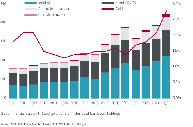 Até o fim de setembro, impulsionadas pela forte alta de preços e por entradas robustas de investidores, as posições de investidores em ouro (via ETFs, barras e moedas, e futuros de COMEX) chegaram a cerca de 2,8% do total de ativos sob gestão (AUM) em ações, renda fixa (ex-reservas de bancos centrais) e alternativos.