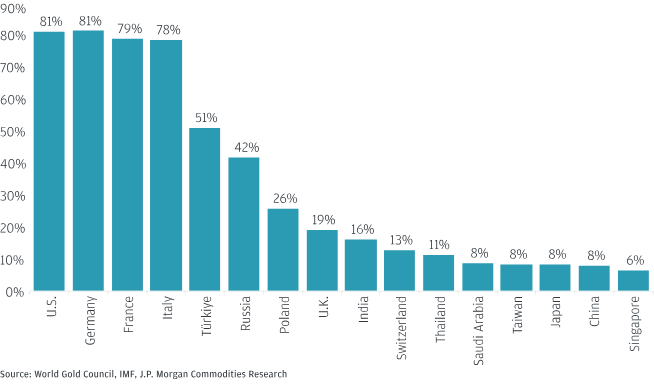Ao mesmo tempo, alguns dos maiores compradores nos últimos anos têm sido bancos centrais cujas reservas de ouro já excedem 10%. De acordo com um estudo do BIS de 2020, bancos centrais em mercados emergentes (EM) ou aqueles que usam moedas de commodities se beneficiam de manter mais de 20% de suas reservas em ouro, pois isso oferece forte proteção contra risco cambial.