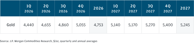 No geral, a J.P. Morgan Global Research projeta que os preços tenham média de US$ 5.055/oz no trimestre final de 2026, subindo em direção a US$ 5.400/oz até o fim de 2027.
