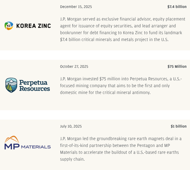 O setor público também está demonstrando interesse em empresas privadas para apoiar a crescente necessidade de minerais críticos. Em 2025, o Pentágono se tornou o maior acionista da MP Materials, o único produtor totalmente integrado de ímãs de terras raras nos EUA, para viabilizar aumento de fabricação. O acordo, o primeiro de seu tipo — no qual o J.P. Morgan foi o único assessor financeiro e lead left arranger [coordenador líder e principal estruturador] em US$ 1 bilhão de financiamento comprometido — acelera a construção de uma cadeia local de suprimento de terras raras ao mesmo tempo em que atende todas as necessidades do Pentágono por ímãs de terras raras.