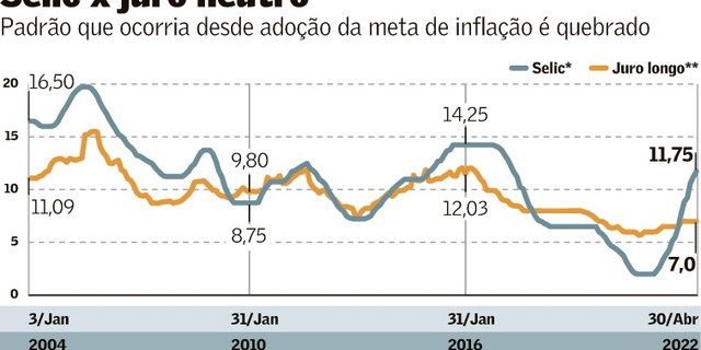 Essa quebra de padrão tem repercussões para a condução da política monetária. O juro longo, quatro anos à frente, é uma estimativa da taxa neutra, aquela que não acelera nem desacelera a inflação. Para baixar a inflação, portanto, o BC teria que subir o juro além da taxa neutra.