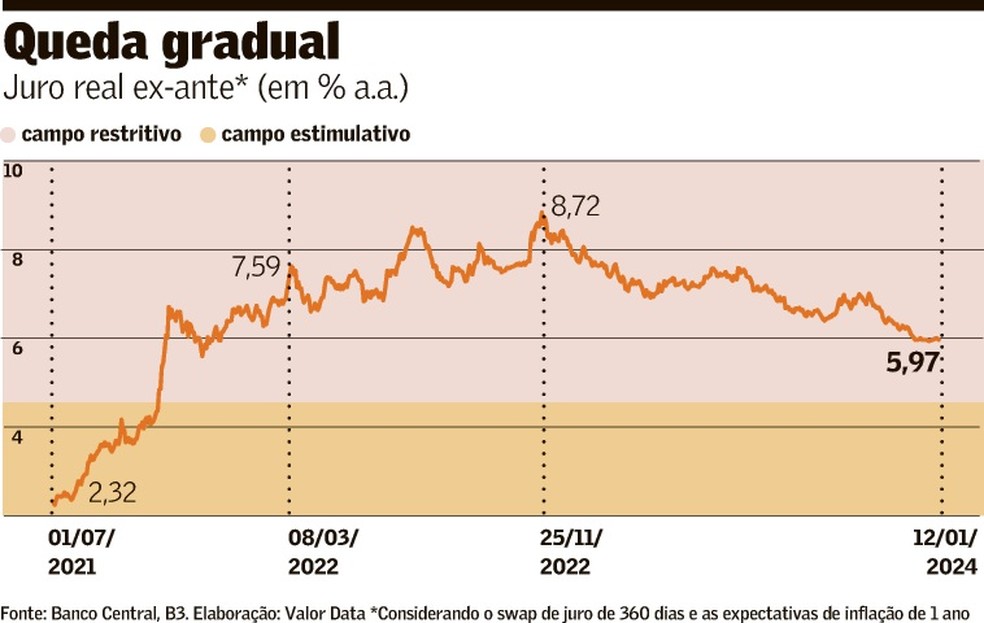 Cálculo do Valor Data a partir do contrato de swap de juro de 360 dias descontada a expectativa de inflação um ano à frente indica um juro real em 5,97%, nos menores níveis desde dezembro de 2021.