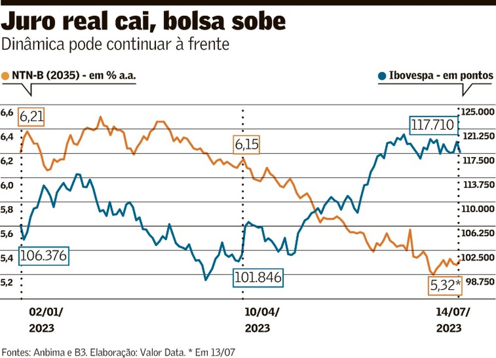 Na medida em que profissionais do mercado passam a enxergar um cenário político, fiscal e macroeconômico mais favorável ao Brasil, cresce a expectativa por um patamar de juro real menor e, consequentemente, uma maior atratividade para a bolsa, já que a taxa é usada para calibrar projeções de lucratividade das empresas. No longo prazo, normalmente quando o juro real cai as ações tendem a subir.