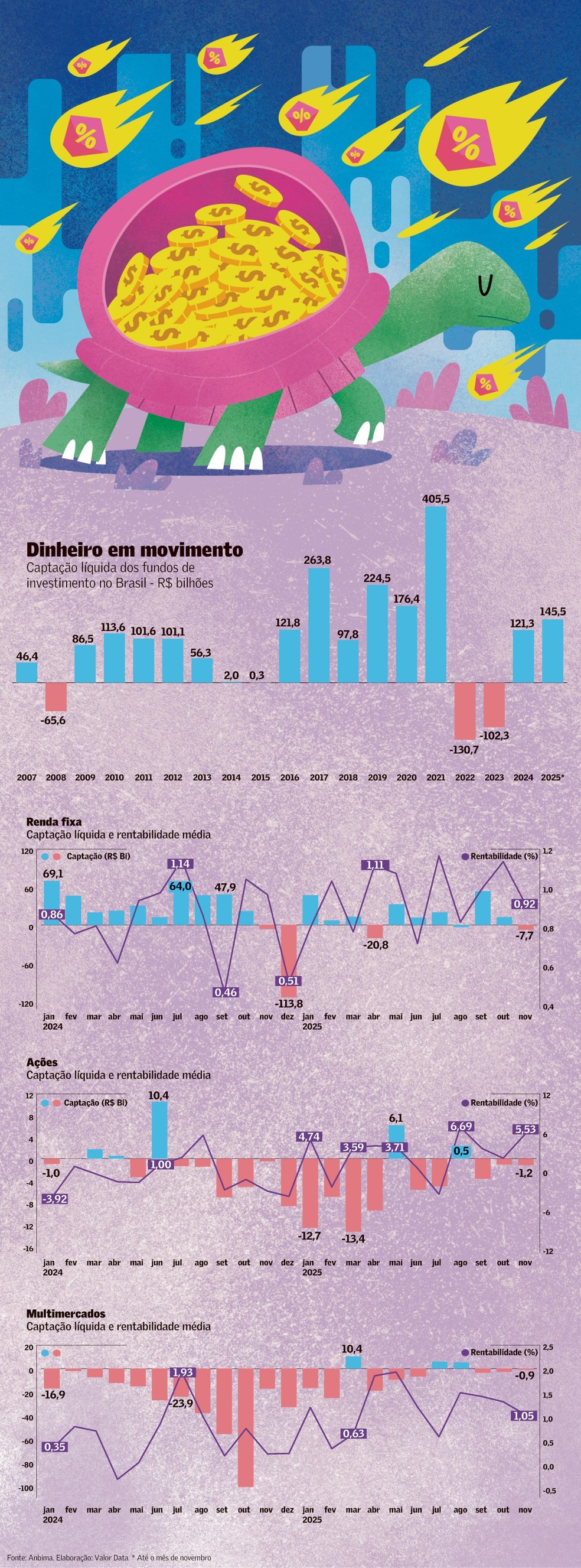 Os fundos de maior risco tiveram saídas relevantes, incentivadas em grande parte pela Selic alta. Foi o caso dos multimercados, com resgates líquidos de R$ 61,7 bilhões até o fim de novembro. Nos fundos de ações, o total ficou negativo em R$ 52,8 bilhões, mesmo com a disparada de 32% do Ibovespa no período. Já a renda fixa opera no azul, apesar dos resgates líquidos de R$ 16,4 bilhões no mês passado. No ano, até novembro, esses fundos acumulam captação líquida de R$ 162,5 bilhões, um tombo de 56% em relação a igual período de 2024.