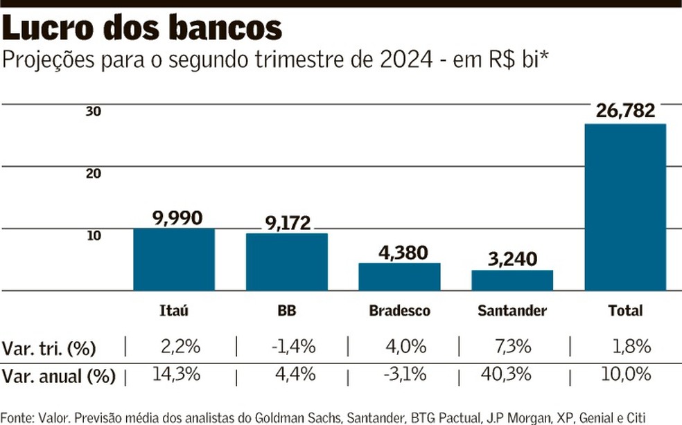 Levantamento do Valor feito com sete casas mostra que Itaú Unibanco, Banco do Brasil, Bradesco e Santander devem ter um lucro combinado de R$ 26,78 bilhões no segundo trimestre, com alta de 1,8% sobre o trimestre anterior e de 10% na comparação com o segundo trimestre de 2023. A temporada de balanços começa na quarta-feira (24), com a divulgação dos resultados do Santander.