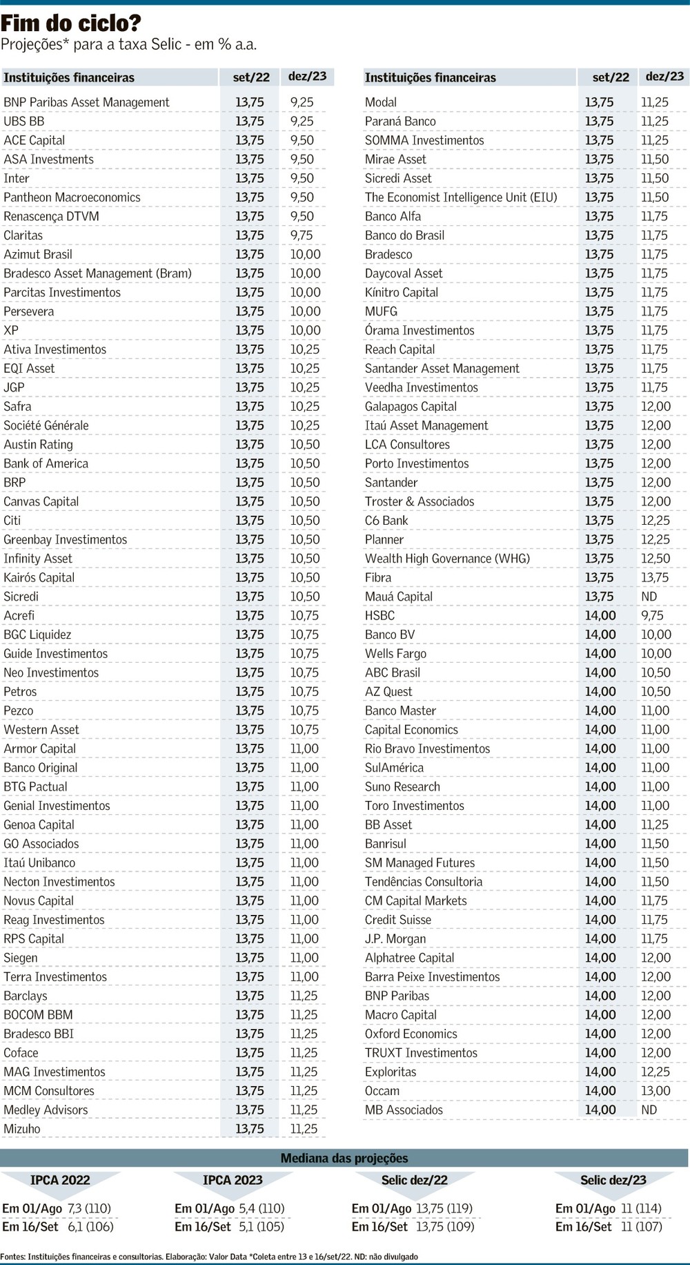 De acordo com a pesquisa realizada pelo Valor, a mediana de 106 projeções para o IPCA em 2022 foi de 6,10%, enquanto o ponto médio das estimativas (105) para o IPCA em 2023 alcançou os 5,10%. Já para o ano de 2024, a mediana de 91 projeções coletadas foi de 3,50%, nível idêntico ao observado na pesquisa realizada antes da última reunião do Copom, em agosto.