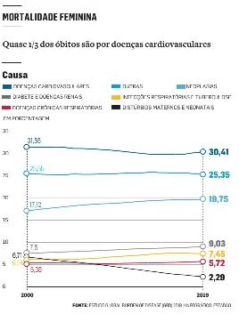 Por causa disso, a Sociedade Brasileira de Cardiologia (SBC) lança nesta quinta-feira um documento de alerta sobre o problema. No manifesto, a entidade propõe reduzir a mortalidade feminina decorrente de doenças cardiológicas em 30% até 2030. “Na mortalidade proporcional das mulheres (que considera todas as causas de morte), as doenças cardiovasculares têm proporção maior do que nos homens”, diz Glaucia Moraes de Oliveira, diretora da SBC. Entre brasileiras, essa taxa era de 30,4% em 2019, ante 26,4% entre homens. Segundo Glaucia, a prevalência das doenças cardiovasculares tem crescido entre jovens e mulheres no pós-menopausa.
