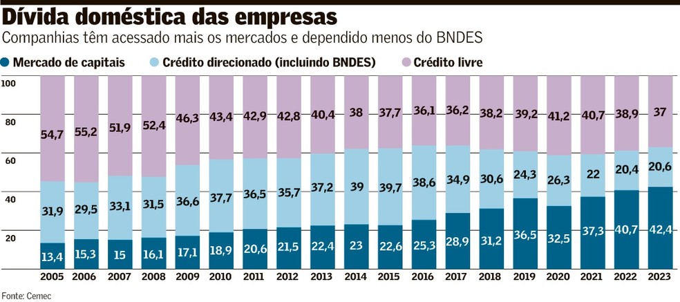 A participação de recursos provenientes do mercado de capitais na dívida consolidada das companhias, que era de 21,5% em 2012, praticamente dobrou para 42,4% em 2023, maior patamar histórico. Os dados fazem parte de novo estudo do Centro de Estudos de Mercado de Capitais (Cemec-Fipe). Enquanto isso, a fatia do crédito bancário livre caiu de 42,8% para 37%, no mesmo período, e a dos recursos tomados no BNDES baixou de 28,2% para 10,2%, o menor nível desde o início da série, em 2005.