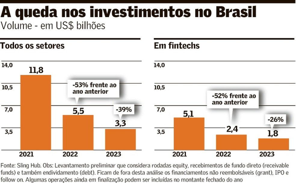 Os juros altos e as incertezas macroeconômicas em 2023 foram um duro golpe para o segmento de venture capital, e o Brasil teve o segundo ano seguido de queda nos investimentos em startups. Levantamento feito para o Valor pela Sling Hub, plataforma de inteligência de dados do setor, mostra que, no ano passado, o recuo foi de 39%, melhor que a América Latina (-41%).