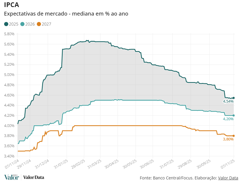Para 2026, a mediana das expectativas para o Índice Nacional de Preços ao Consumidor Amplo (IPCA) continuou em 4,20%, para 2027, seguiu em 3,80%, e, para 2028, se manteve em 3,50%.