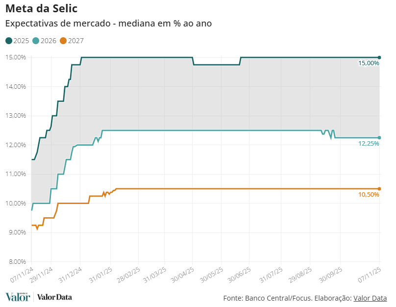 Para a taxa básica de juros (Selic), a mediana das estimativas manteve-se em 15% no fim de 2025, pela 20ª semana seguida; em 12,25% no fim de 2026 pela 7ª semana seguida, seguiu em 10,50% em 2027 pela 39ª semana, e se manteve em 10% pela 46ª semana.