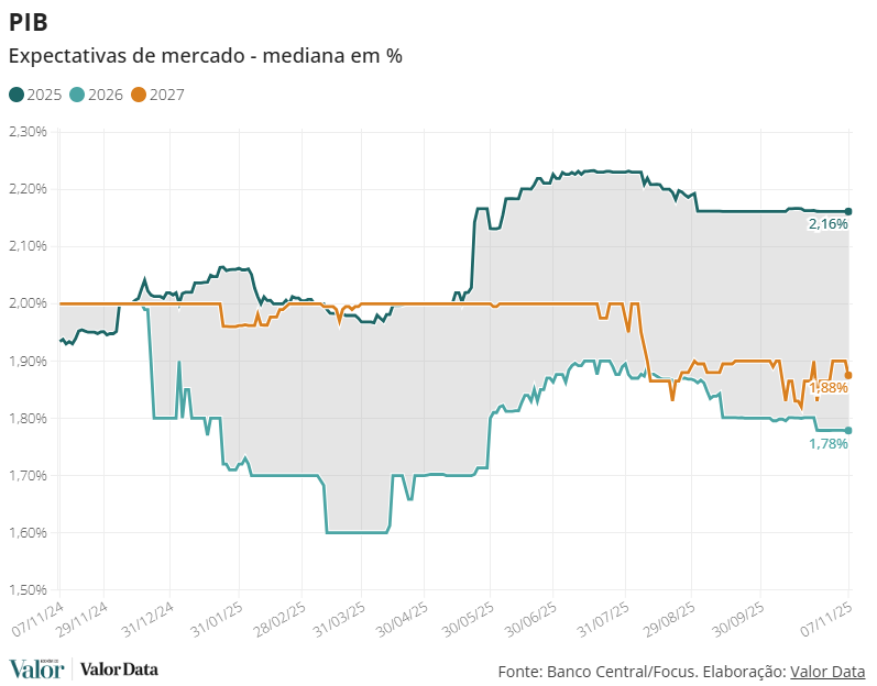 Para 2026, a mediana das expectativas para a expansão do Produto Interno Bruto (PIB) continuou em 1,78%, para 2027, caiu de 1,90% para 1,88% e, para 2028, se manteve em 2%, pela 87ª semana seguida.