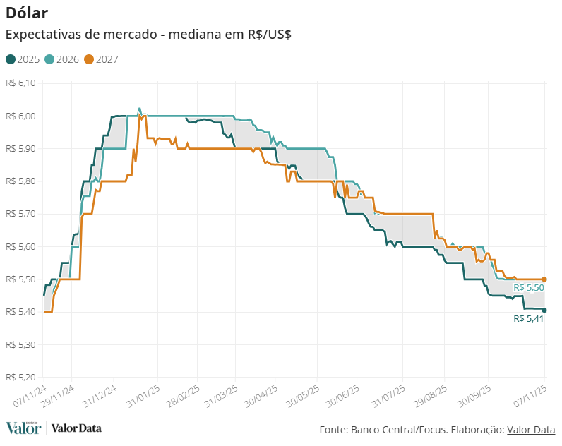 Já para o dólar no fim de 2025, a mediana das projeções dos economistas se manteve em R$ 5,41.