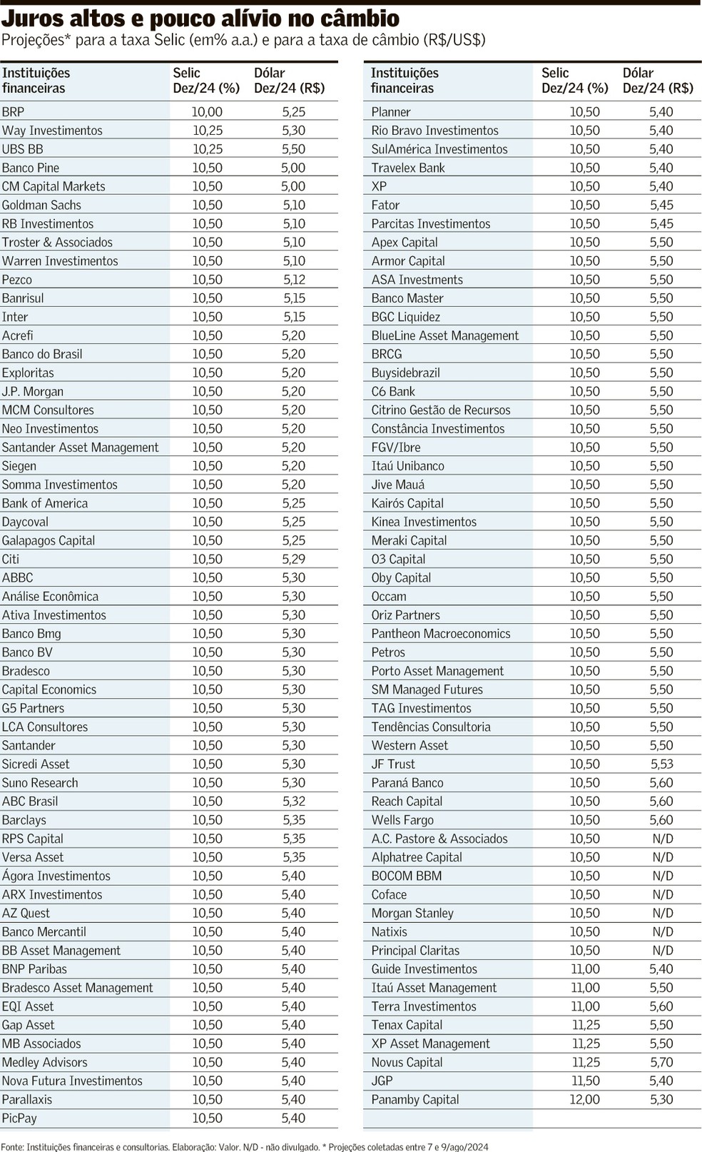 Nesse sentido, a incerteza em torno dos rumos da moeda brasileira segue em níveis elevados. A sensação mediana no mercado, porém, é de que o câmbio não deve voltar aos níveis bem mais apreciados vistos no ano passado e que o alívio no real tende a ser limitado. Na pesquisa extraordinária conduzida pelo Valor com 102 instituições financeiras e consultorias entre os dias 7 e 9 de agosto, a mediana das estimativas para o dólar no fim deste ano ficou em R$ 5,40.