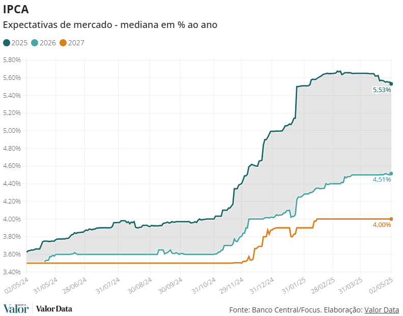 A pesquisa da última sexta-feira, divulgada hoje, mostrou ainda que a mediana das projeções dos economistas do mercado para a inflação oficial brasileira em 2025 caiu pela terceira semana seguida, de 5,55% para 5,53%.