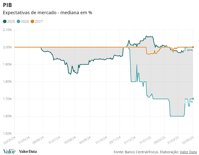 Para 2026, a mediana das expectativas para a expansão do Produto Interno Bruto (PIB) também ficou estável, em 1,70%, e, para 2027, se manteve em 2,00%.