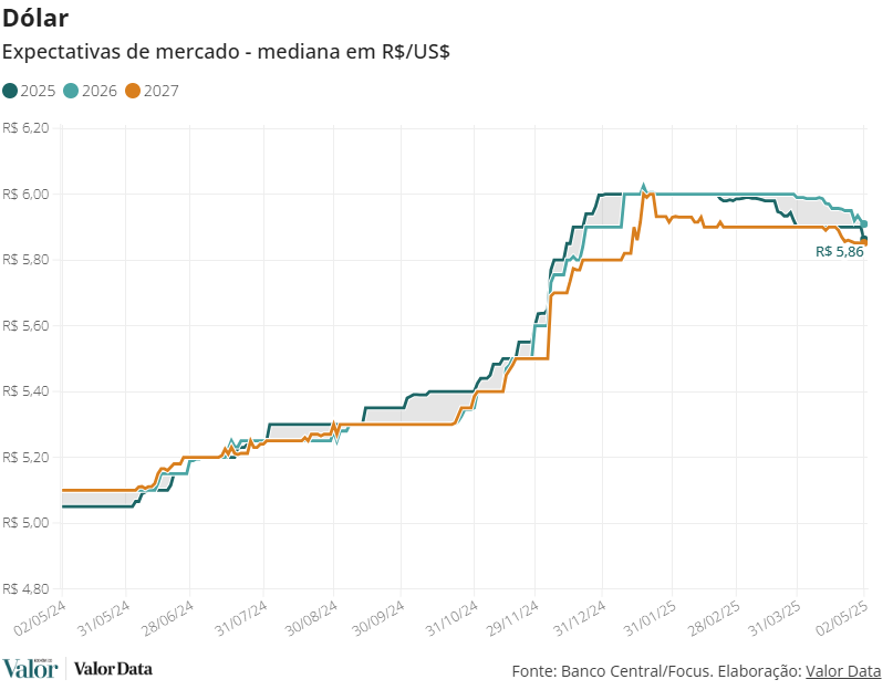 Para 2026, a mediana das expectativas para a moeda americana caiu pela quinta semana consecutiva, de R$ 5,95 para R$ 5,91 entre uma semana e outra. Para 2027, caiu de R$ 5,86 para R$ 5,85.