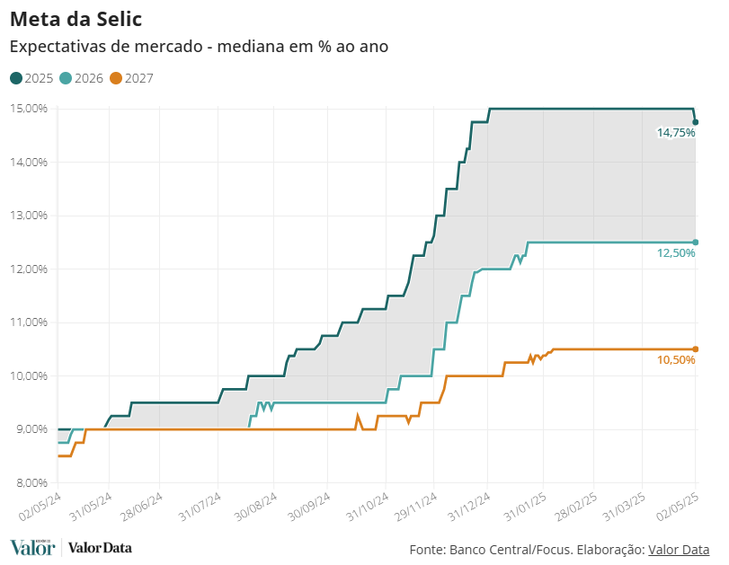 Para 2026, a taxa Selic se manteve em 12,50% e, para 20227, em 10,50%.