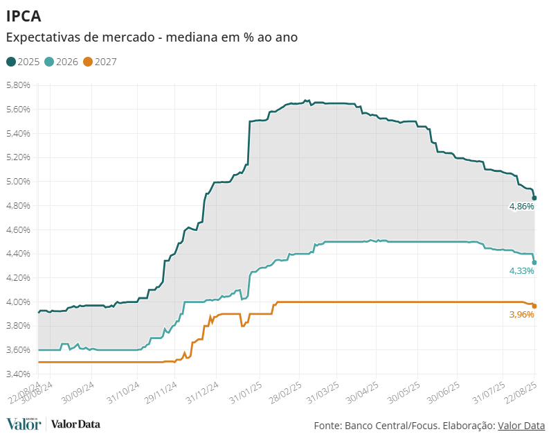 Para 2026, a mediana das expectativas para a alta do Índice Nacional de Preços ao Consumidor Amplo (IPCA) foi alterada de de 4,40% para 4,33%. Para 2027, foi reduzida de de 4,00% para 3,97%.