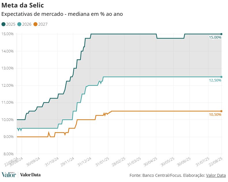 Para a taxa básica de juros (Selic), a mediana das estimativas foi mantida em 15% no fim de 2025, pela nona semana seguida; em 12,50% no fim de 2026 pela 30ª semana seguida, e em 10,50% em 2027 pela 28ª semana.