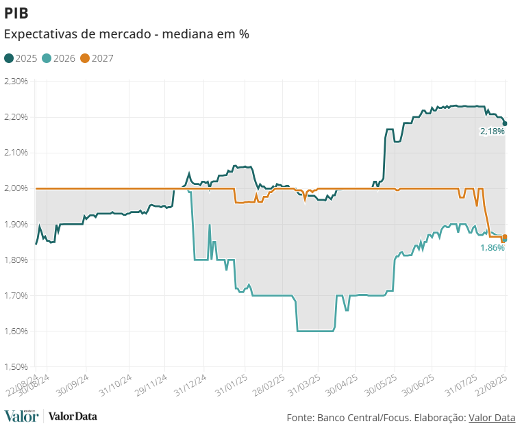 Para 2026, a mediana das expectativas para a expansão do Produto Interno Bruto (PIB) foi alterada de 1,87% para 1,86%, e, para 2027, mantida em 1,87%.