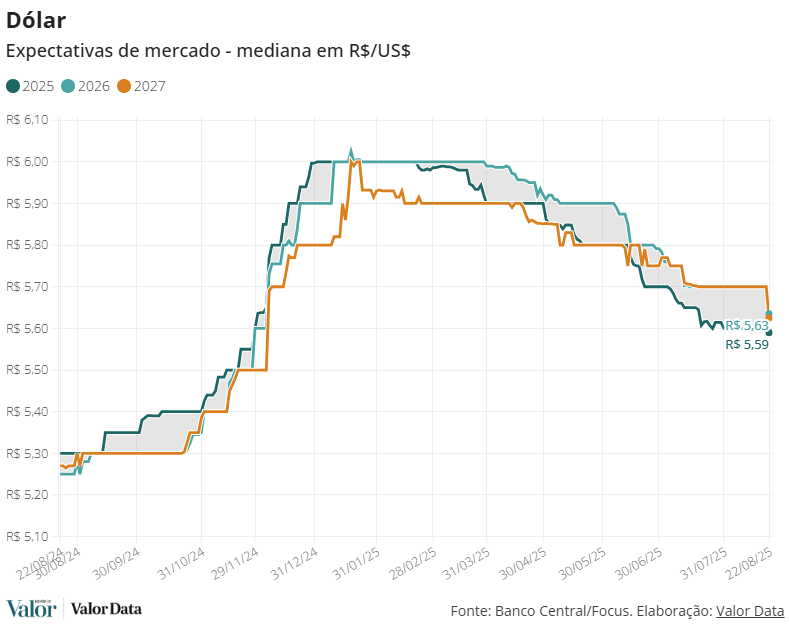 A mediana das projeções para o dólar no fim de 2025 foi reduzida de R$ 5,60 para R$ 5,59.