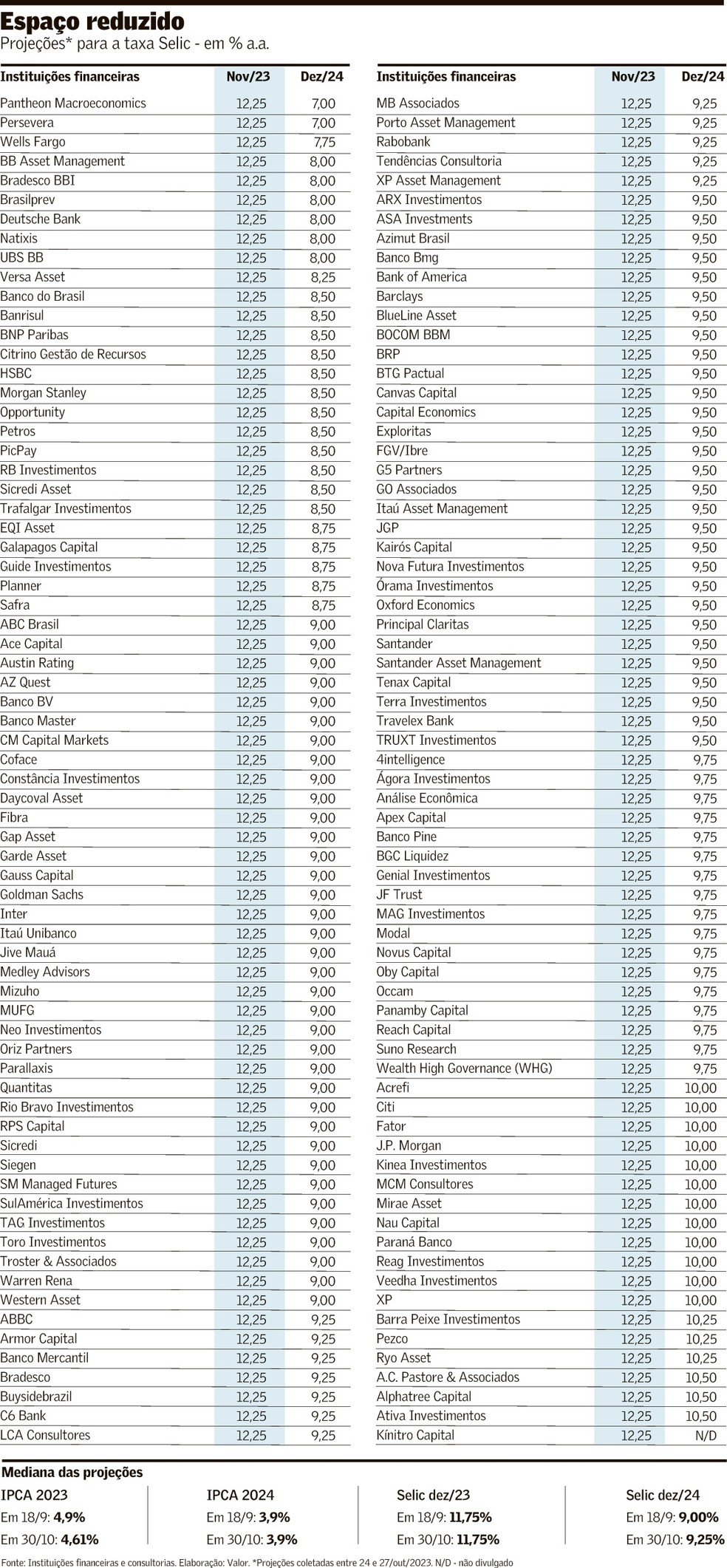 Em levantamento elaborado pelo Valor com 140 instituições financeiras e consultorias, foi unânime a aposta em uma redução de 0,5 ponto na taxa básica nesta semana, que deve sair, portanto, de 12,75% para 12,25%. Além disso, a grande maioria dos agentes (96,4%) espera um novo corte de 0,5 ponto no fim deste ano, o que levaria o juro a 11,75%. Em relação a dezembro de 2024, porém, a pesquisa indica um aumento na mediana das projeções dos economistas para a Selic, que passou de 9% na pesquisa de setembro para 9,25%.