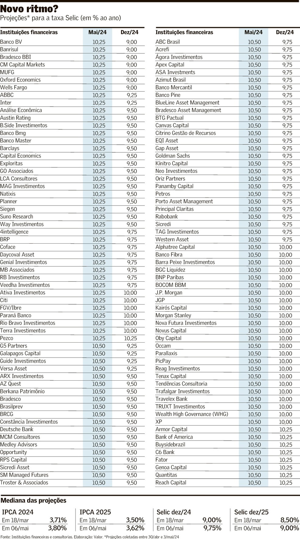 O número mais recente mostra uma tendência de aumento, nos últimos dias, das projeções que contemplam um corte de juros menor. Na pesquisa anterior do Valor, realizada entre 18 e 19 de abril — data posterior à mudança do tom de Campos Neto —, 54% dos participantes do mercado viam um corte de 0,5 ponto, enquanto 46% projetavam redução de 0,25 ponto.