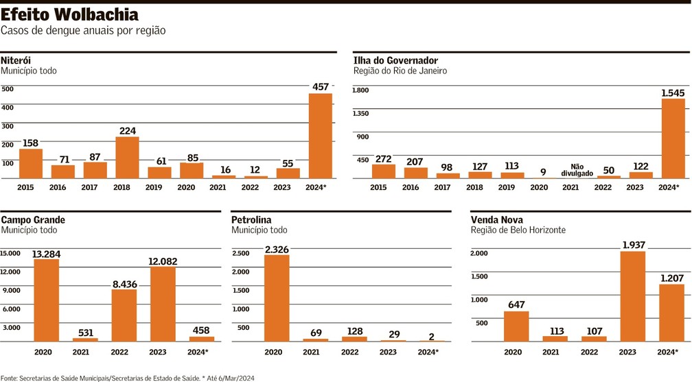 Na cidade do Rio de Janeiro, 29 bairros receberam os insetos modificados em 2015. O programa começou pela Ilha do Governador. Segundo a prefeitura, a região teve 122 casos de dengue confirmados em 2023 e 1.207 este ano, até esta quarta-feira, 6.