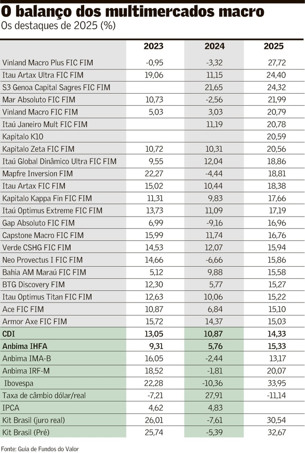 Em 2025, o índice de hedge funds da Anbima (IHFA) teve um dos seus melhores desempenhos dos últimos cinco anos, com valorização de 15,3%, ante 14,3% do CDI. Em janeiro, o IHFA subia 2,7%, também acima do CDI de 1,16%.