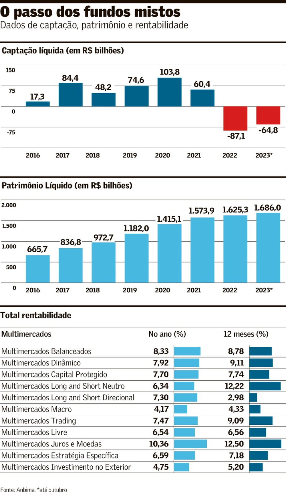 No ano, até outubro, os multimercados tiveram resgates líquidos de R$ 64,8 bilhões. Incluindo as saídas de novembro, até o dia 23, de R$ 18,5 bilhões, a conta já é negativa em R$ 87,5 bilhões, já superando os R$ 87,1 bilhões de 2022, quando a performance em geral foi boa. Os dados são da Anbima, que representa o mercado de capitais e de investimentos. A classe reunia R$ 1,7 trilhão.