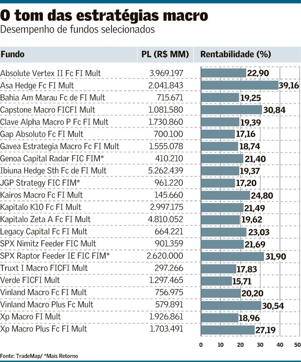 Num 2022 em que os multimercados registraram saques recordes de R$ 86,8 bilhões e interromperam uma sequência de seis anos de captação positiva (R$ 397 bilhões acumulados), conforme dados da Anbima, os portfólios com estratégia macro tiveram um dos melhores desempenhos da história recente. Há ganhos de até 39%, caso do Asa Hedge, seguido por SPX Raptor, Vinland e Capstone, com carteiras com valorização acima de 30%. Há ainda uma série de exemplos com valorização perto dos 20%.