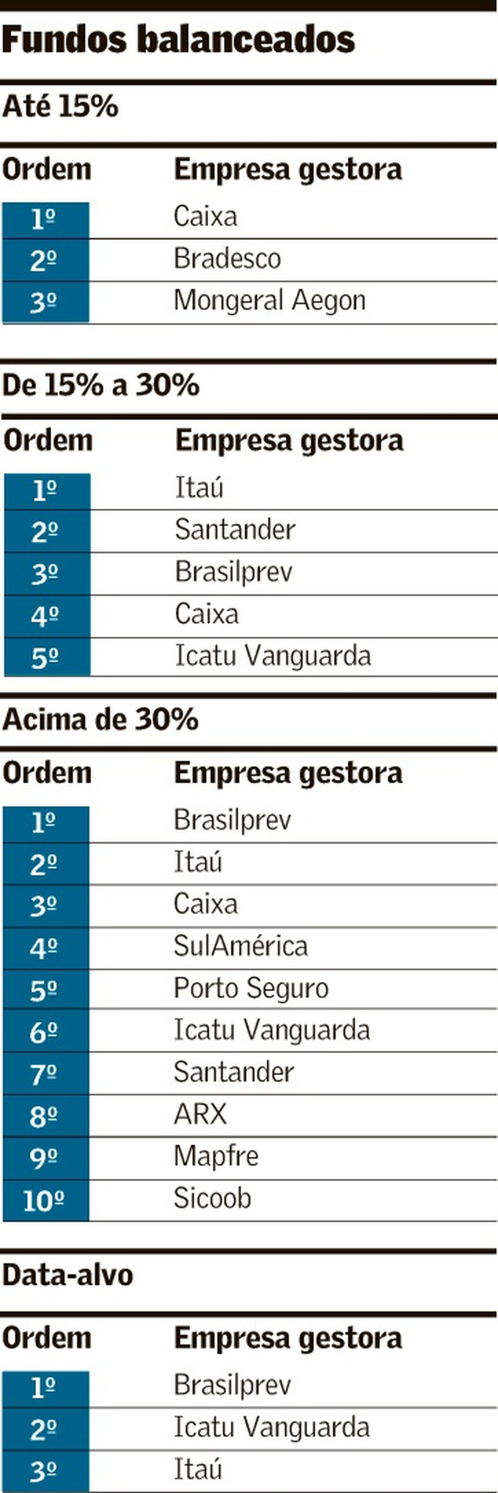 O boletim da Anbima mostra uma captação líquida positiva de R$ 68,1 milhões de janeiro a outubro para os fundos de previdência balanceados. Considerando as subdivisões dessa categoria, contudo, o desempenho em termos de captação varia bastante. Os que se saíram melhor foram os balanceados até 15 (R$ 107,2 milhões no período), fundos em que a exposição à renda variável está limitada a 15% da carteira. Os demais são 15-30 (captação líquida negativa de R$ 19,3 milhões) e acima de 30 (captação líquida negativa de R$ 19,9 milhões).