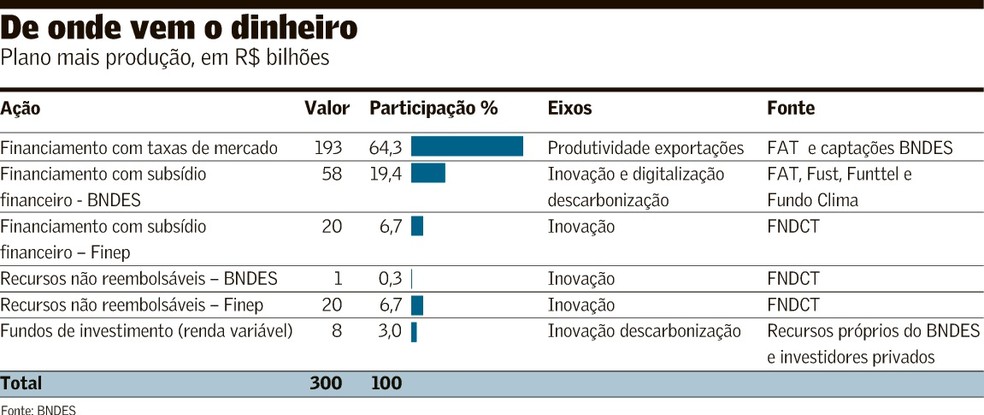 Dos R$ 300 bilhões a serem aplicados até 2026 na nova política industrial, R$ 250 bilhões (83% do total) devem sair do BNDES. O número inclui empréstimos a taxas de mercado, subsídios implícitos para inovação a custo de Taxa Referencial (TR) e aplicações de capital em fundos de investimento (equity). Dentro do bolo total, a Financiadora de Estudos e Projetos (Finep) também terá participação, inclusive apoiando projetos não reembolsáveis (ver quadro abaixo).