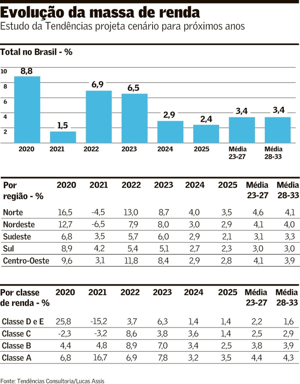 A massa de renda total dos domicílios brasileiros deve crescer nos próximos anos de maneira mais intensa nas regiões Norte, Nordeste e Centro-Oeste que no Sudeste e no Sul do país, aponta o estudo da Tendências Consultoria chamado “Classes de Renda e Consumo no Brasil: 2023-2033”, antecipado ao Valor. O estudo leva em conta a massa real de renda – descontada a inflação.