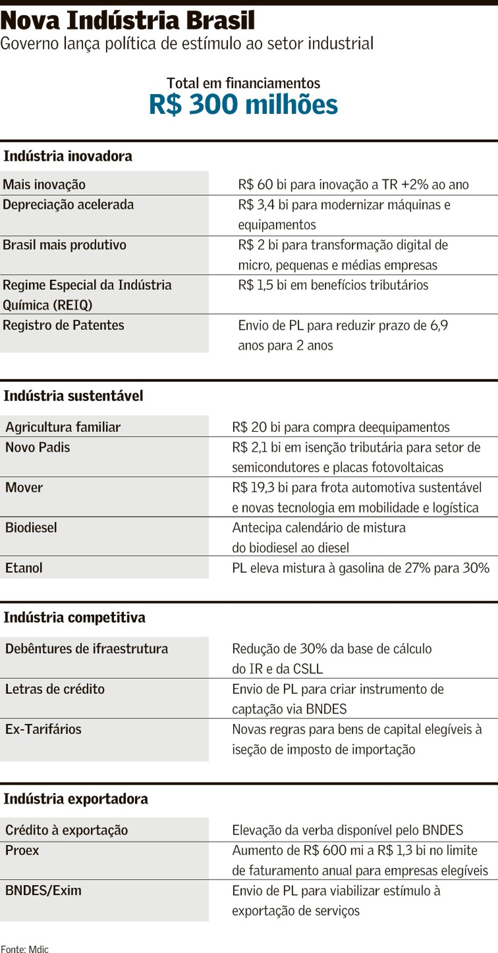 A nova política industrial do governo, anunciada nesta segunda-feira (22), prevê cerca de R$ 300 bilhões em aportes até 2026, via financiamento, subsídios e participação acionária em projetos. O presidente Luiz Inácio Lula da Silva e o vice, Geraldo Alckmin, disseram que o valor é suficiente para modernizar o parque fabril. Empresários presentes na solenidade viram apenas “um bom começo”.