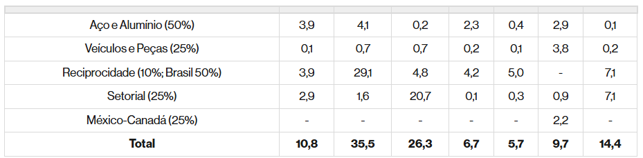 A cifra leva em conta as tarifas já anunciadas e a imposição de novas tarifas setoriais, que o banco espera que entrem em vigor, como a tarifa de 50% sobre cobre e de 25% sobre produtos farmacêuticos, semicondutores, minerais críticos e produtos de madeira, previstas para o terceiro trimestre de 2025.