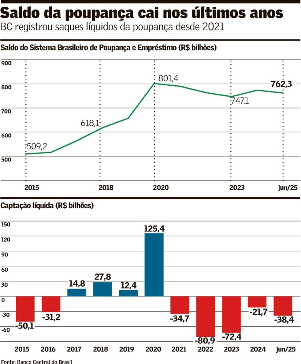 O saldo do Sistema Brasileiro de Poupança e Empréstimo (SBPE) vem caindo seguidamente desde 2021. Em 2021, 2022 e 2023, houve uma saída líquida da poupança, resultado das aplicações menos as retiradas, de R$ 188 bilhões. No ano passado, a saída líquida foi de R$ 21,7 bilhões. Só neste ano, até junho, o montante retirado da caderneta foi de R$ 38,4 bilhões, segundo dados do BC.