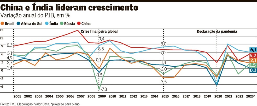 O economista britânico critica duramente as nações emergentes do bloco, que haviam sido apontadas por ele como grandes promessas de crescimento no mundo. Ao idealizar o acrônimo, O’Neill previu que os quatro países juntos teriam um Produto Interno Bruto (PIB) tão grande quanto o do G-6 (o G-7, grupo das principais economias ricas, menos o Canadá). Desde então, com exceção de China e Índia, esses países acumulam taxas de expansão pouco expressivas e políticas econômicas erráticas, quadro agravado no ano passado pela invasão da Ucrânia pela Rússia. “O Brics fortaleceu seu simbolismo superficialmente. Em termos de conteúdo, é decepcionante”, ataca O’Neill.