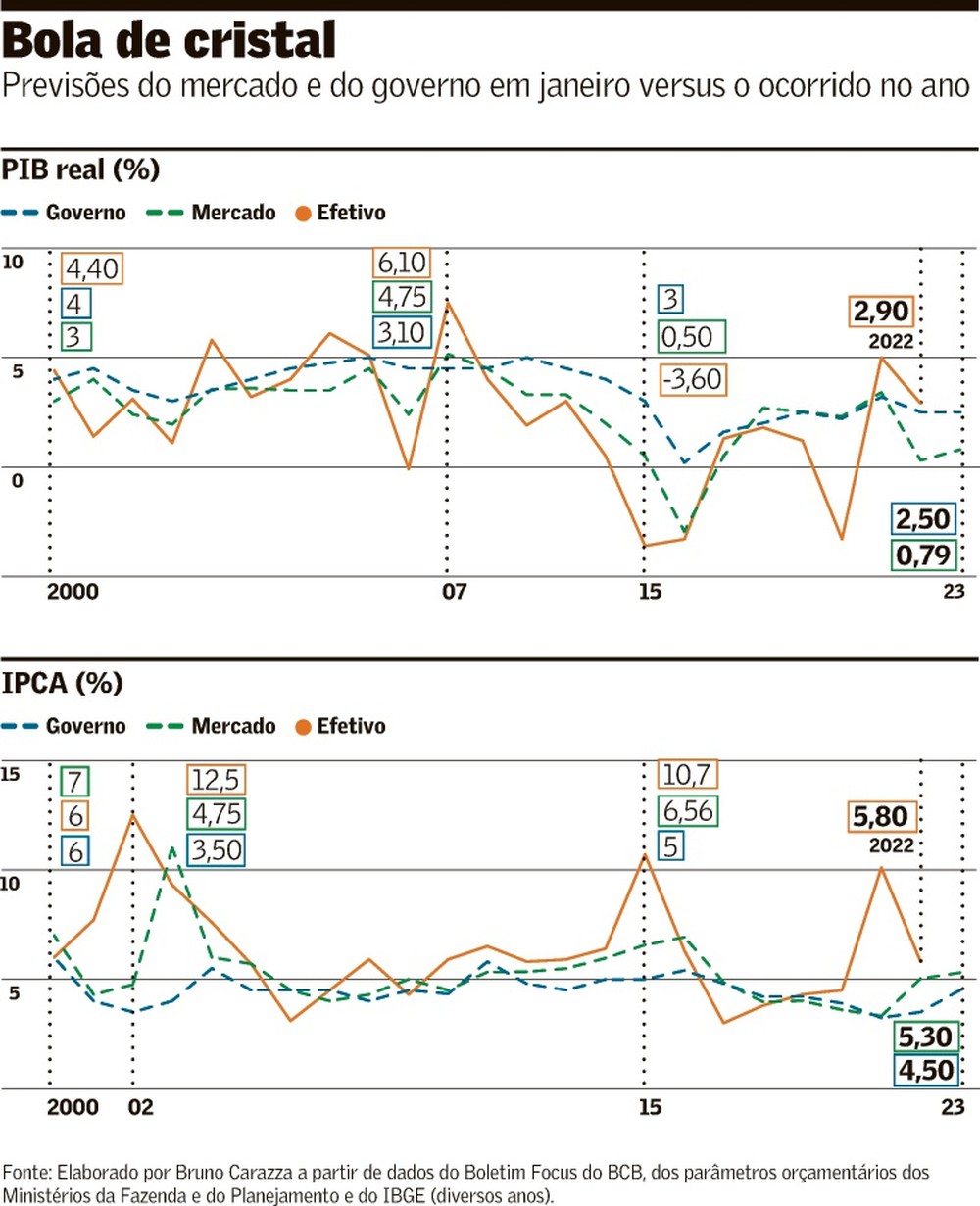 Até o valor do dólar, uma das variáveis mais difíceis de se prever (“Deus inventou o câmbio para humilhar os economistas”, diz a piada) apresenta uma discrepância abaixo de 10% em relação às estimativas com um ano de antecedência, exceto nos anos de grandes crises internacionais ou domésticas.