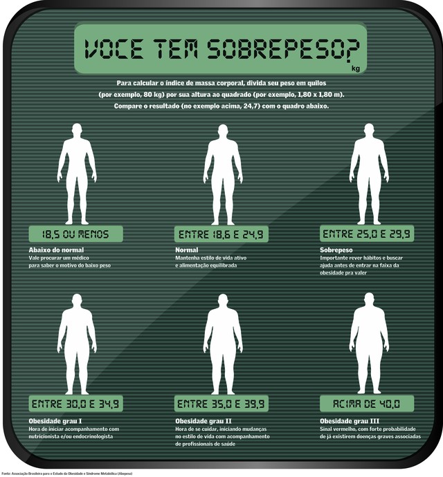 “O controle do peso é um fenômeno complexo que não depende exclusivamente da força de vontade”, contrapõe a endocrinologista Maria Edna de Melo, diretora da Abeso (Associação Brasileira para o Estudo da Obesidade e Síndrome Metabólica). A obesidade pode ser medida de acordo com o IMC (Índice de Massa Corporal): o peso da pessoa dividido pela sua altura ao quadrado. Se o resultado for superior a 25, a pessoa está acima do peso. Se passar de 30, é obesa, e se tiver doenças associadas, como diabetes e hipertensão, precisa urgentemente rever seus hábitos e buscar ajuda.
