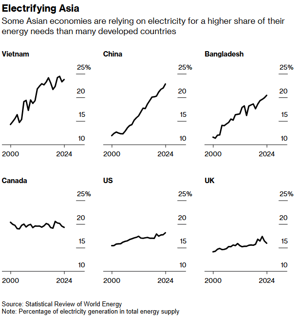 Um novo relatório do think tank de energia limpa Ember conclui que países como Vietnã e Bangladesh estão aumentando mais rapidamente a participação da eletricidade em sua matriz energética do que os EUA. Desde o ano 2000, a China dobrou a participação da eletricidade como proporção da energia primária para quase um quarto, enquanto os EUA e a Europa estagnaram.