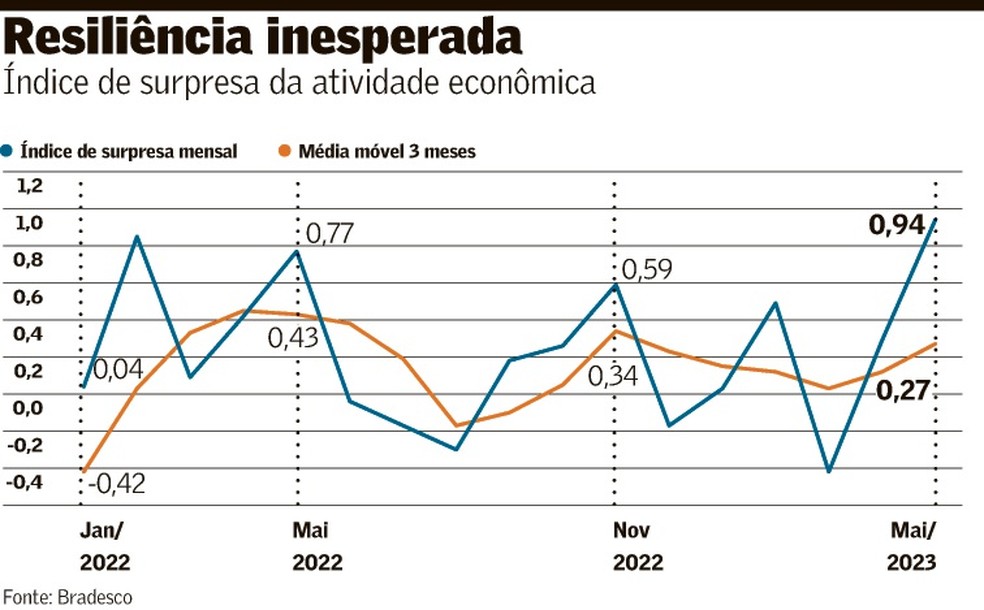 O resultado de indicadores econômicos referentes a março ajuda a contar boa parte do viés altista para o crescimento, já que o mercado foi bastante surpreendido. Esse fenômeno foi capturado no índice de surpresa da atividade econômica, que, nos cálculos do Bradesco, chegou a 0,94 ponto em maio, maior nível desde setembro de 2020. Quanto mais alto o indicador, maior a surpresa positiva do desempenho da atividade econômica em relação às expectativas consensuais do mercado.