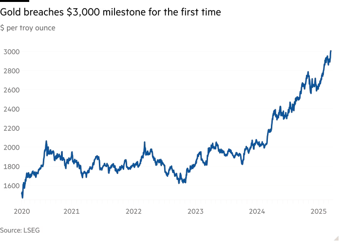 O ouro disparou para um recorde acima de US$ 3.000 por onça-troy, à medida que temores sobre a ameaça ao crescimento global causada pela guerra comercial de Donald Trump levam investidores ao metal como refúgio seguro.
