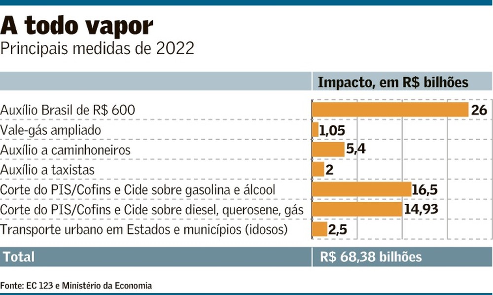 Entre cortes de impostos e novos benefícios, como o Auxílio Brasil de R$ 600, as medidas terão impacto fiscal de pelo menos R$ 68,38 bilhões até o fim deste ano, segundo levantamento feito pelo Valor Fiscal. Outros R$ 87 bilhões foram oferecidos em créditos para as micro e pequenas empresas, que puderam também renegociar R$ 20 bilhões em dívidas tributárias. Por sua vez, trabalhadores tiveram a oportunidade de sacar R$ 30 bilhões do Fundo de Garantia do Tempo de Serviço (FGTS). Já os beneficiários do Auxílio Brasil ganharam permissão para tomar empréstimos consignados usando o benefício como garantia, com as operações chegando a R$ 1,8 bilhão no início desta semana.