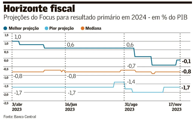 Em magnitude similar, a mediana do Focus, pesquisa do Banco Central com agentes econômicos, indica um déficit de 0,8% do PIB, mas há projeções que ultrapassam 1%, distanciando-se ainda mais da meta do ministro da Fazenda, Fernando Haddad, de zerar o déficit em 2024. A pior projeção no Focus é de um rombo de 1,7% do PIB.