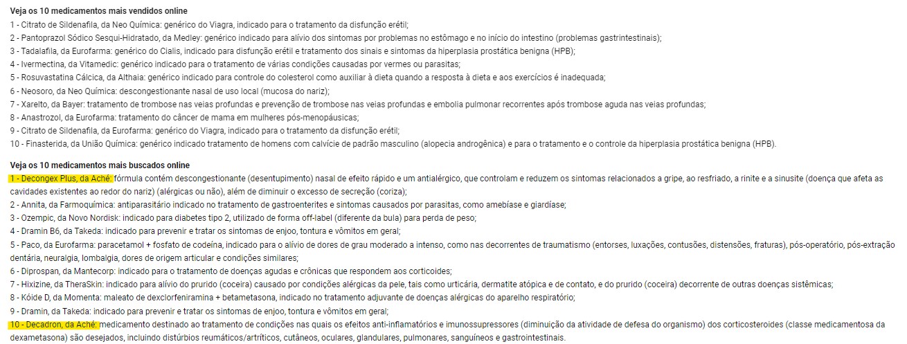1 – Decongex Plus, da Aché: fórmula contém descongestionante (desentupimento) nasal de efeito rápido e um antialérgico, que controlam e reduzem os sintomas relacionados a gripe, ao resfriado, a rinite e a sinusite (doença que afeta as cavidades existentes ao redor do nariz) (alérgicas ou não), além de diminuir o excesso de secreção (coriza);