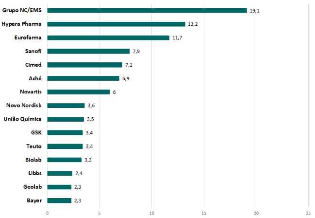 Das empresas que ocupam o top 15, apenas cinco são multinacionais. Considerando as dez principais farmacêuticas em vendas de medicamentos, só duas são do Exterior – Novartis e Novo Nordisk.