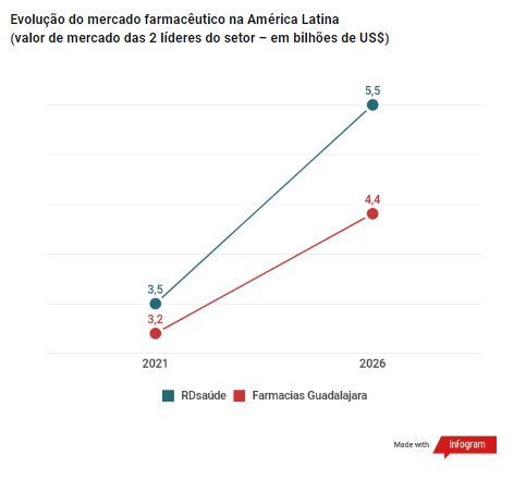 O crescimento tende a ser bem superior ao das Farmacias Guadalajara, segunda maior rede do mercado farmacêutico na América Latina. O avanço previsto é de 37,5% – de US$ 3,2 bi (R$ 17,6 bi) para US$ 4,4 bilhões (R$ 24,2 bi).